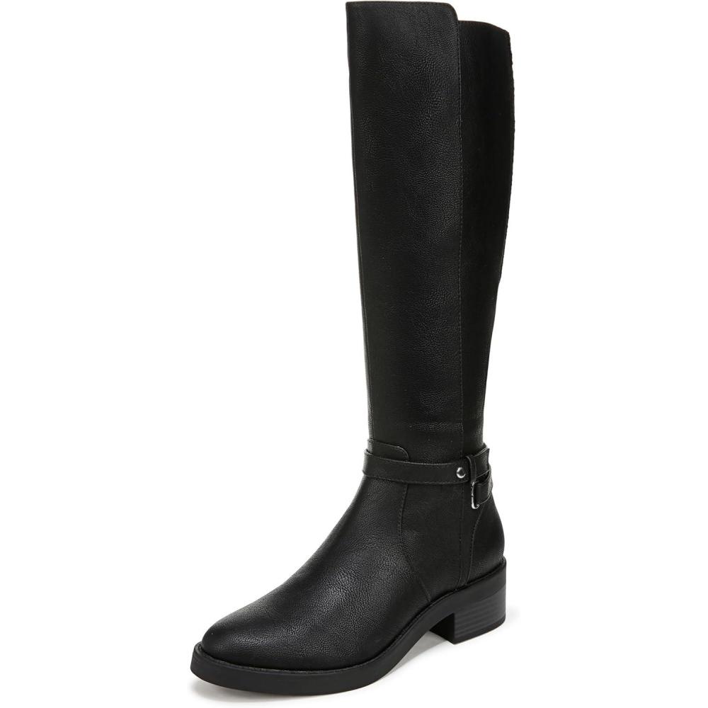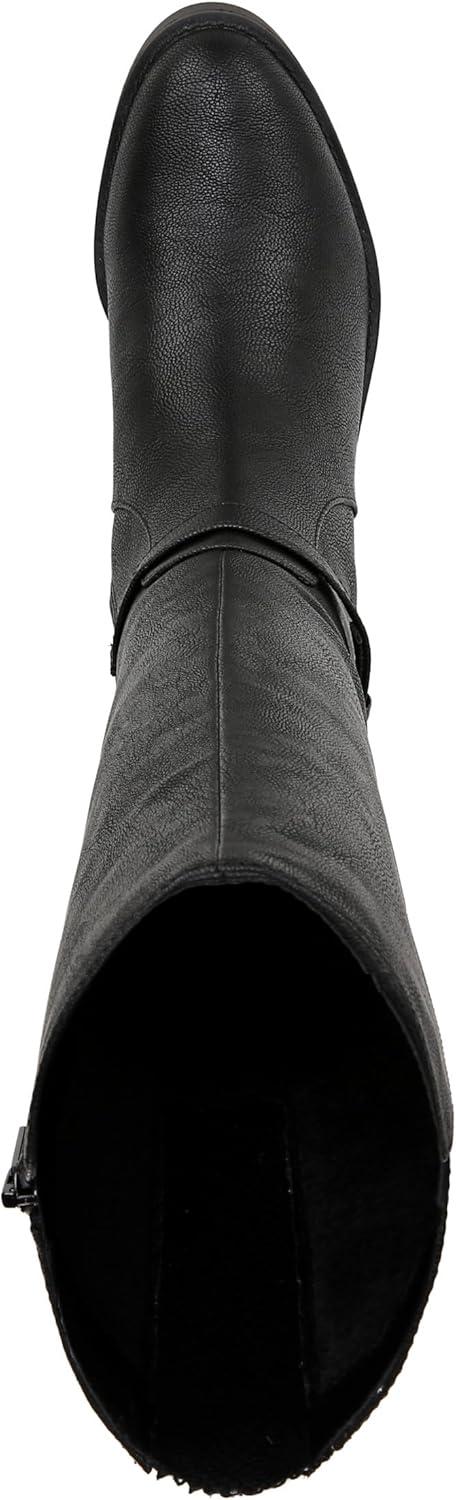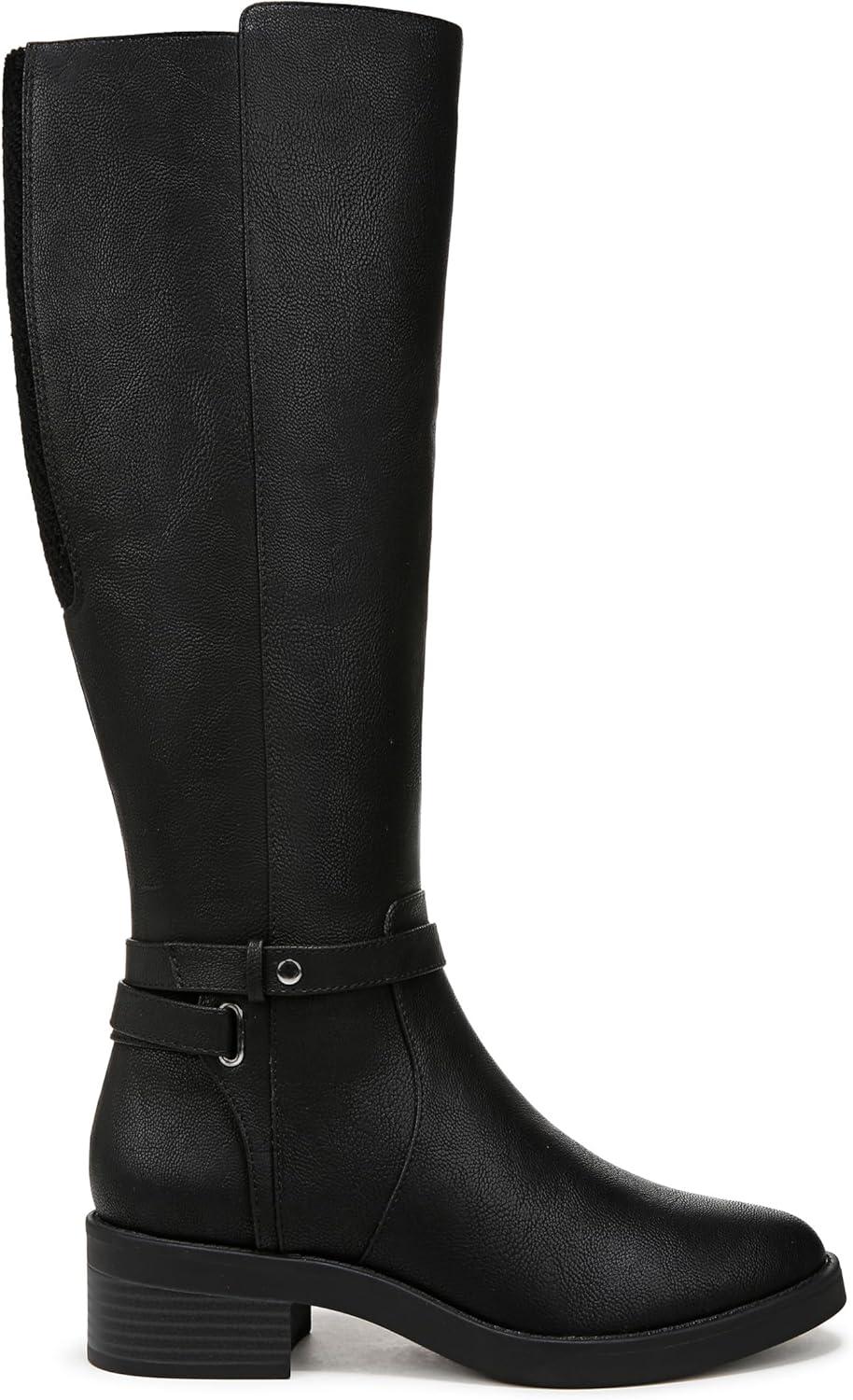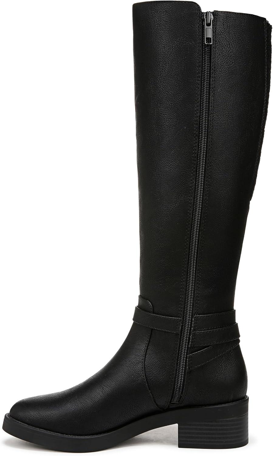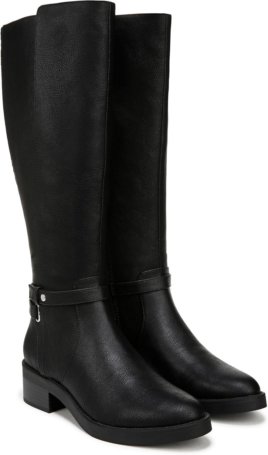 Take your cool-weather look to the next level in these moto-inspired tall boots with unmatched comfort. Faux leather upper with a round toe, inside zipper for easy on/off, decorative strap and buckle details, and stretch gore for extra flexibility and maximum comfort. Linings crafted with partially recycled materials. Soft System® comfort package provides all-day support, flex, and cushioning. Traction sole provides you with extra stability. 15 inch boot height, 14 3/4 inch calf circumference. Note: Measurements based on size 6 boot. For each half size larger, shaft height increases by . 12 in, circumference by . 20 in. Just Right Height 1 3/4 inch block heel.