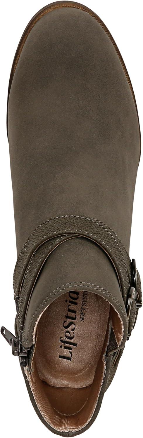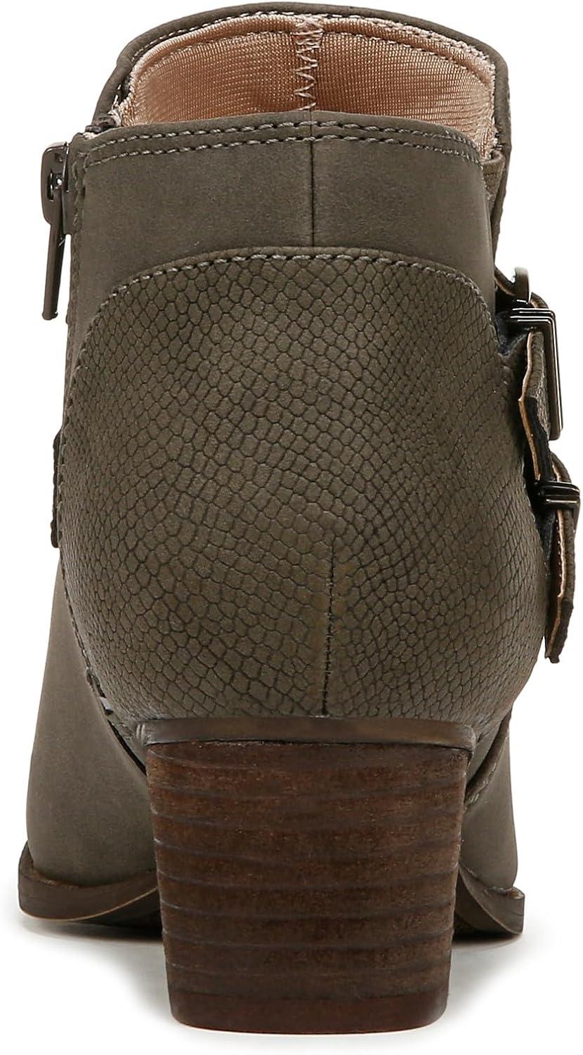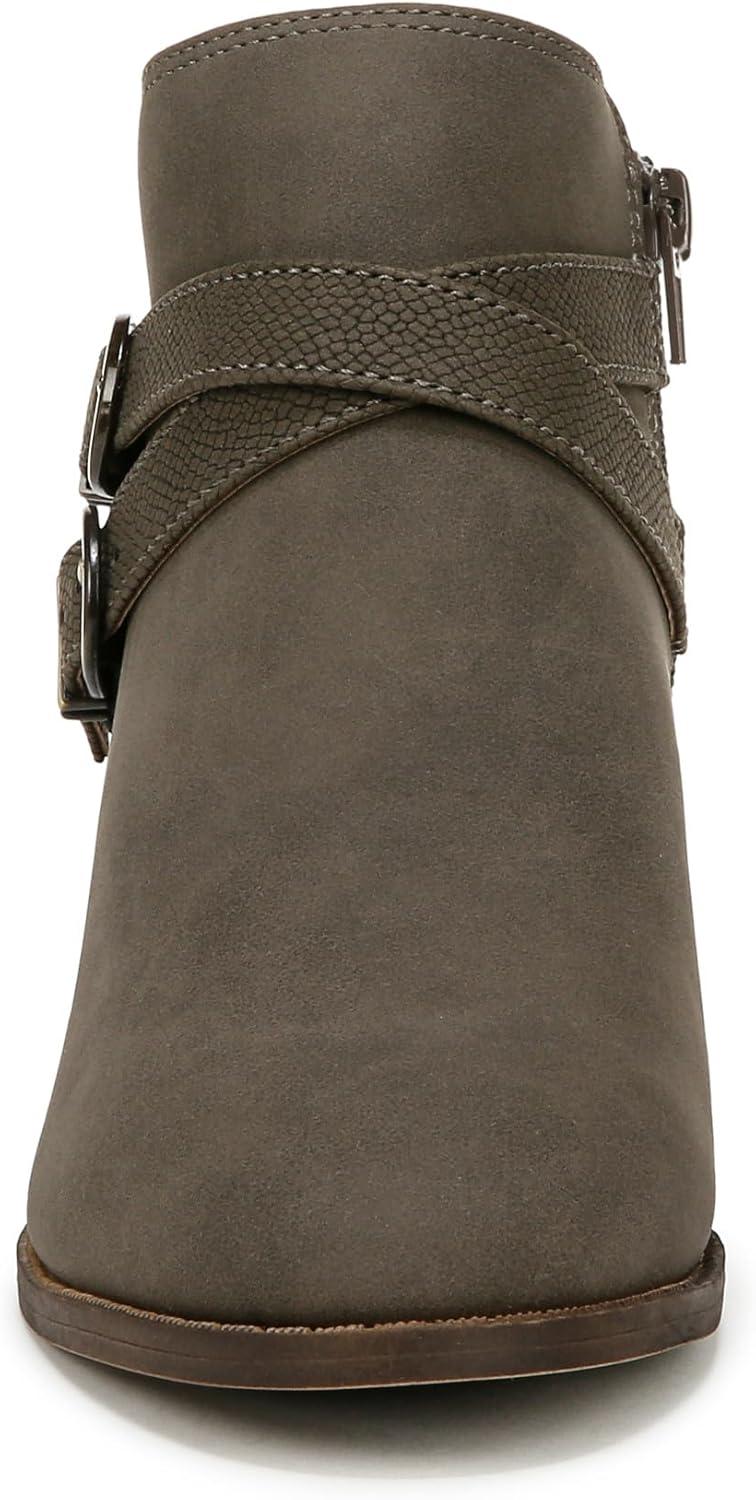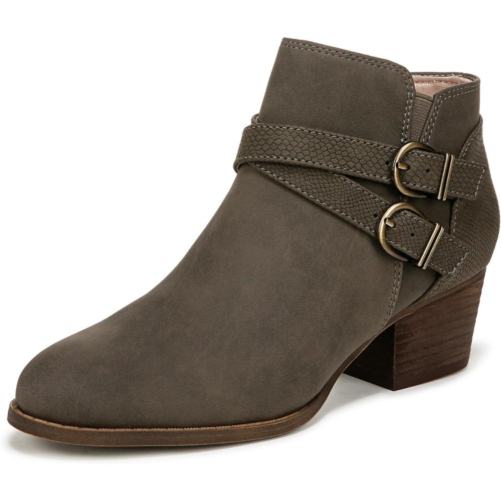 Make the Western trend work for your wardrobe in this cool Western ankle boot. Faux leather upper with a round toe, decorative straps with buckle details, built-in stretch, and functional inside zip. Linings partially crafted with recycled materials. Soft System® comfort package provides all-day support, flex, and cushioning. Traction sole provides you with extra stability. Just Right Height 1 7/8 inch stacked block heel.