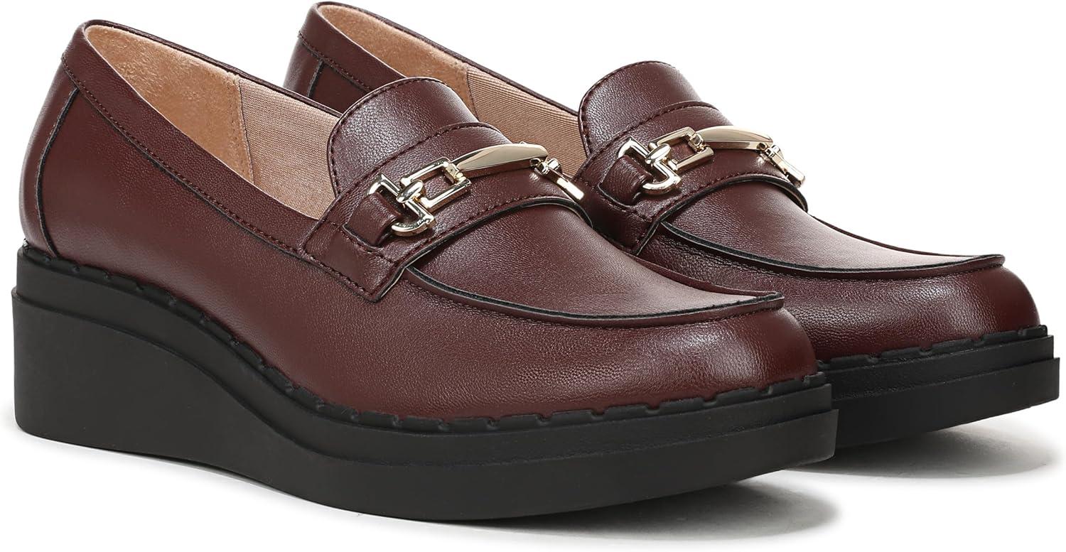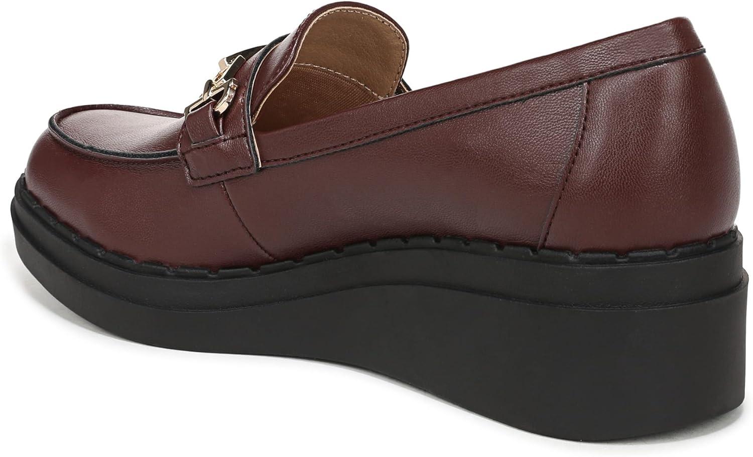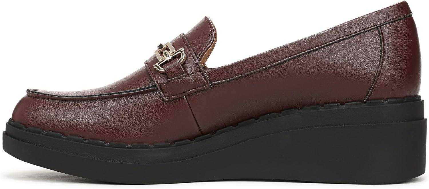 Get now-trending style combined with life-changing comfort in these lightweight platform loafers for women with standout details. Faux leather upper with a round toe, slip-on fit, decorative strap and metallic hardware accent, and comfortable platform sole. Bzees® FreeFoam™ comfort technology for cloud-like cushioning, shock absorption, and an ultra-lightweight feel. Traction sole provides you with extra stability. Just Right Height 2 1/4 inch wedge heel.