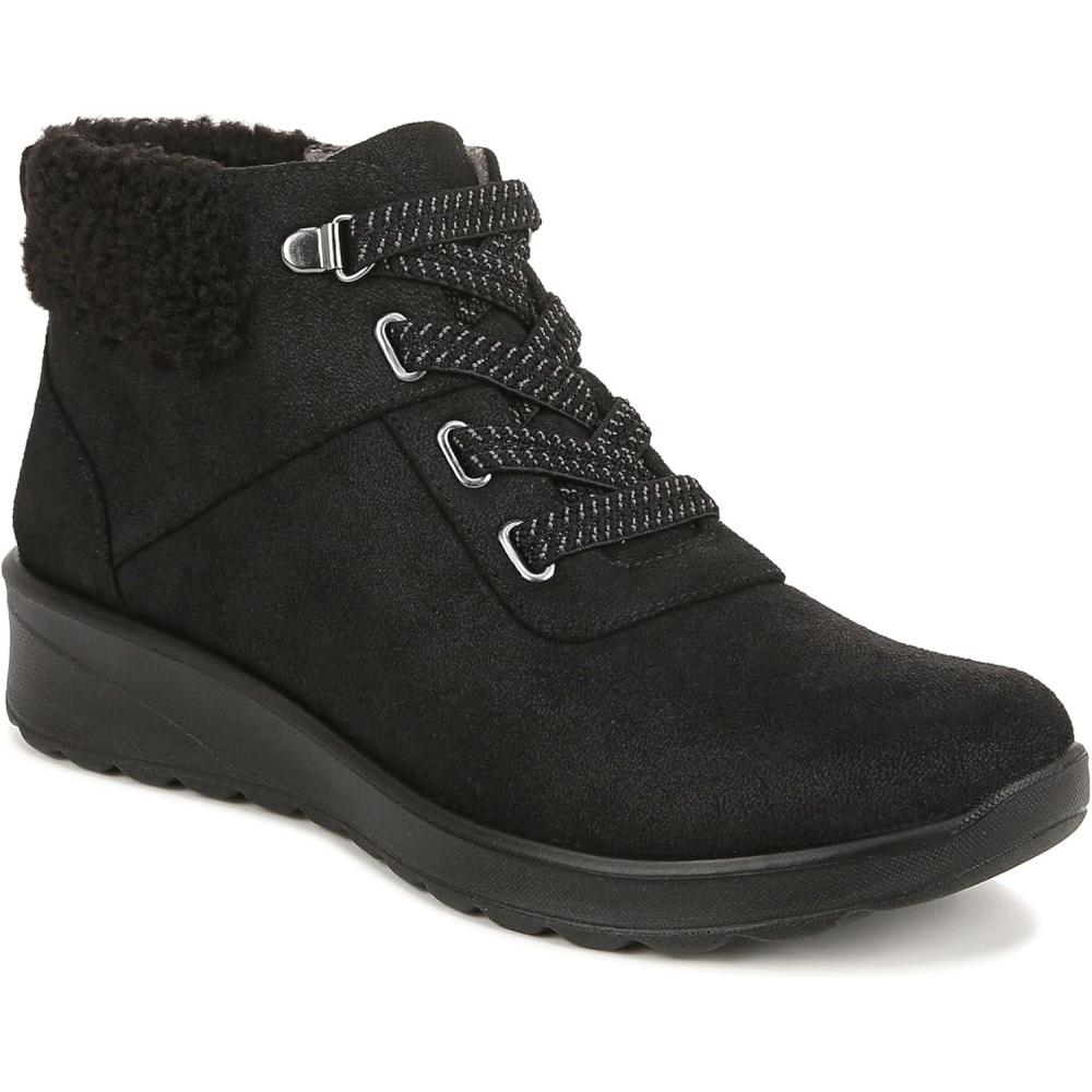 Women's comfort fashion bootie. Cozy comfortable ankle boots for woman with comfort cloud technolgy. Cute boots for women that zip on! Jump into our incredibly cozy ankle boots for that warm and fuzzy feeling. Stretch leather fabric upper with partially recycled sock lining/counter pocket and round toe. Side zipper. Faux stretch laces. Cozy collar with back pull tab. Lug sole for added traction. BLOOM™ materials: Sustainable algae-infused foam layer under the insole. BZEES Cloud Technology: Designed so you’ll feel weightless, energized and free. Air Infused Outsoles: Bzees are ultra-lightweight, soft, & bouncy. Dynamic Stretch Uppers: Stretch fabrics move & groove with you. Free Foam Footbeds: Crazy-cushy anatomical insoles are blow-your-mind comfy. ComfortBlast Foam: Our most premium foam with unbelievable rebound, luxe cushioning, and comfort that never quits. DreamPuff foam padding at the heel. SoCush arch support. 1 1/4 inch wedge heel. EVA outsole. Get Width It: Countless pairs of Bzees come in wide width shoes for women. Machine Washable: Wash on cold and air dry.