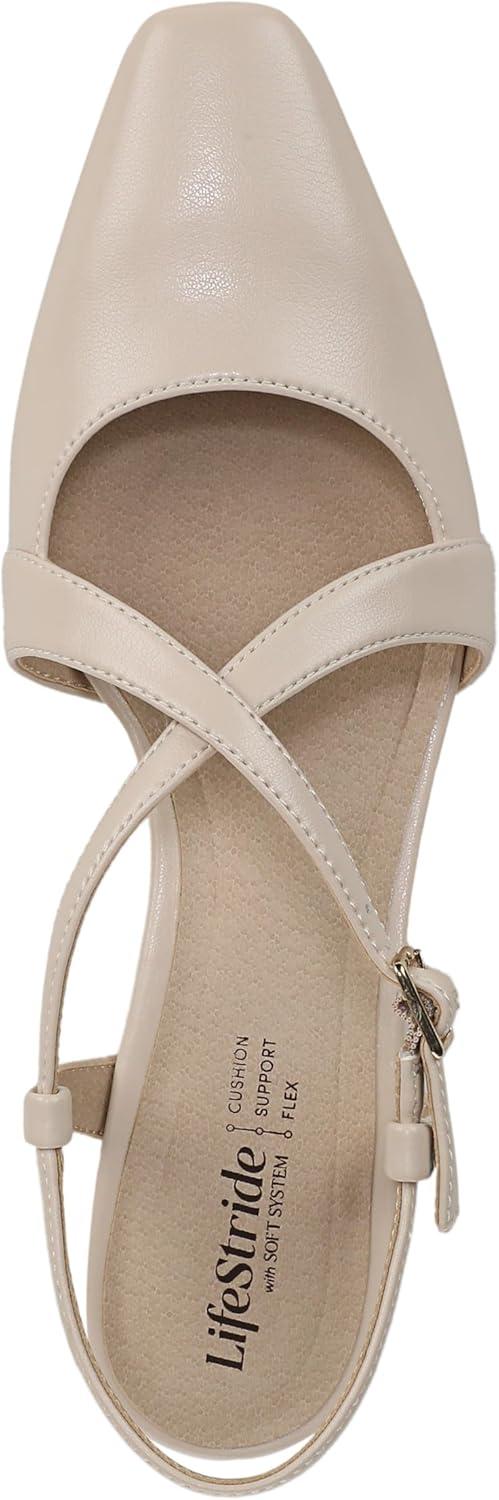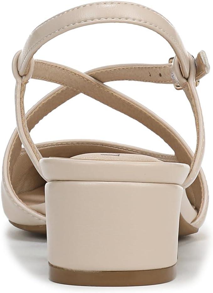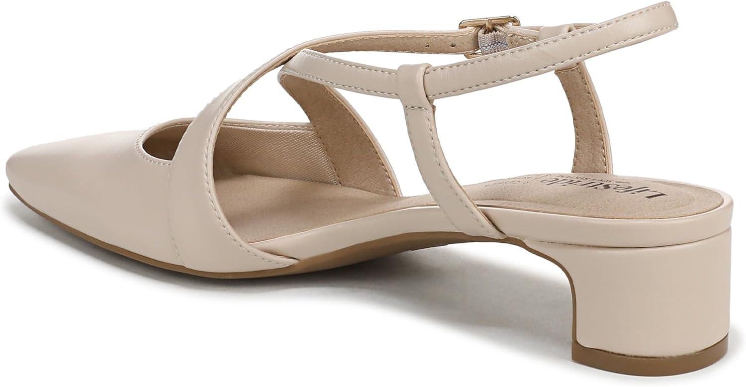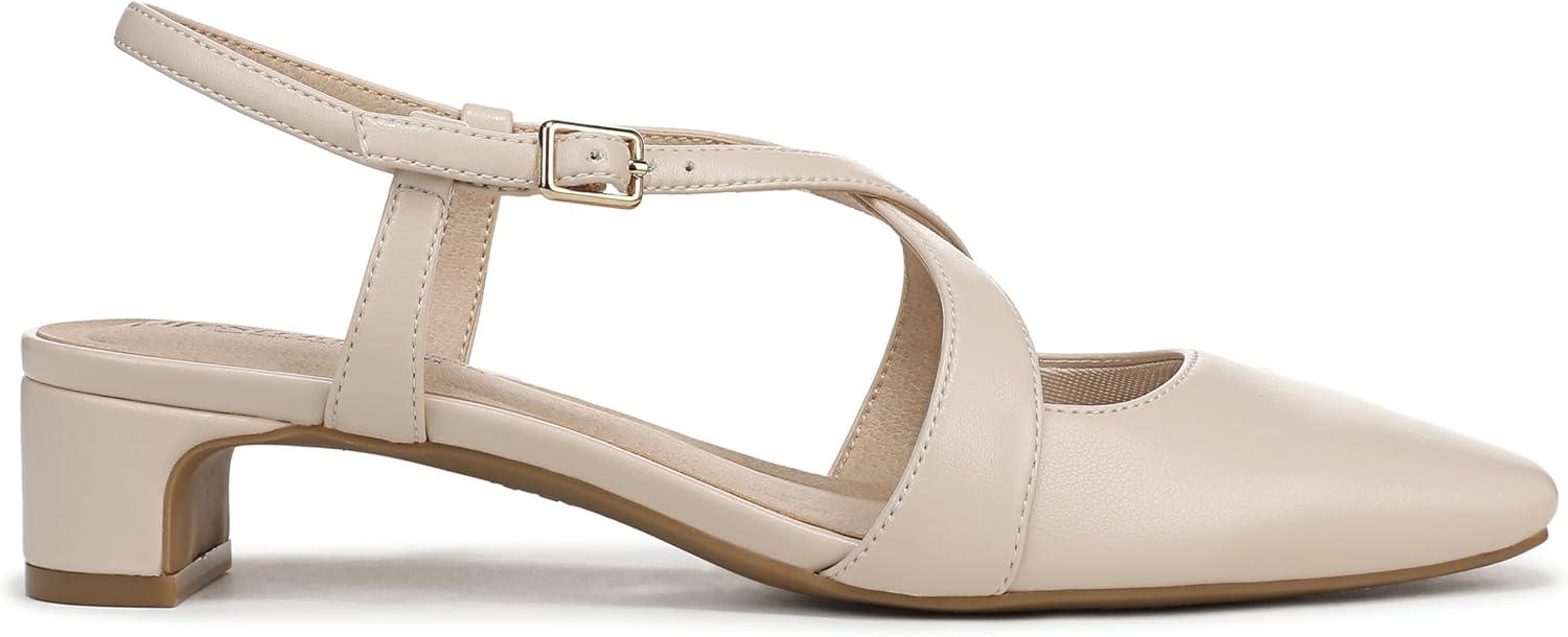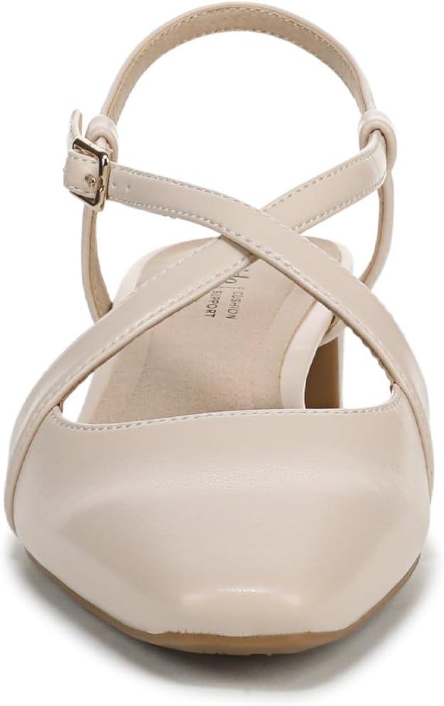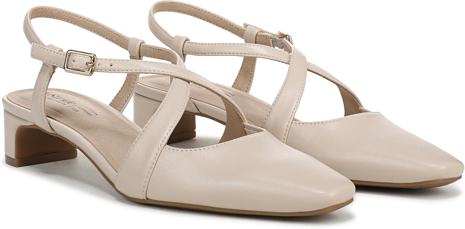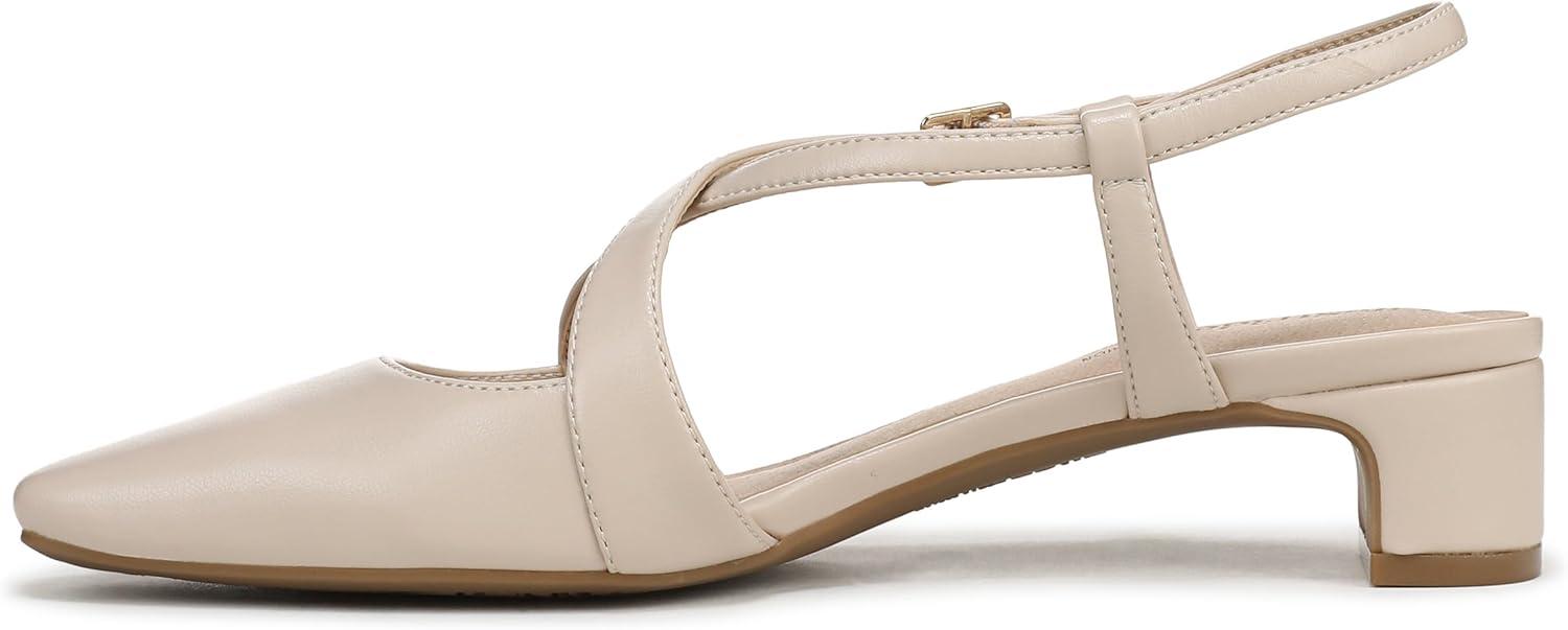 ALL-DAY COMFORT: Trusted Soft System® technology and foam insole deliver cushion, arch support, and flexibility in these comfortable dress shoes VERSATILE STYLE: Elegant strappy design with adjustable buckle closure and cross strap detail, perfect for women's work shoes and after-hours events LOW BLOCK HEEL: 1 1/3 inch block heel gives the right lift for slingback pumps, providing balance and poise throughout your day SLINGBACK CONVENIENCE: Secure fit with an adjustable strap, making these slingback heels easy to slip on and off MODERN DETAILS: Sleek faux leather finish, square toe shape, and stylish color choices make these ideal dress shoes for women, from office to evening