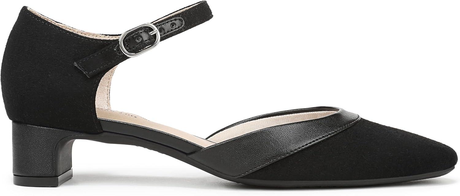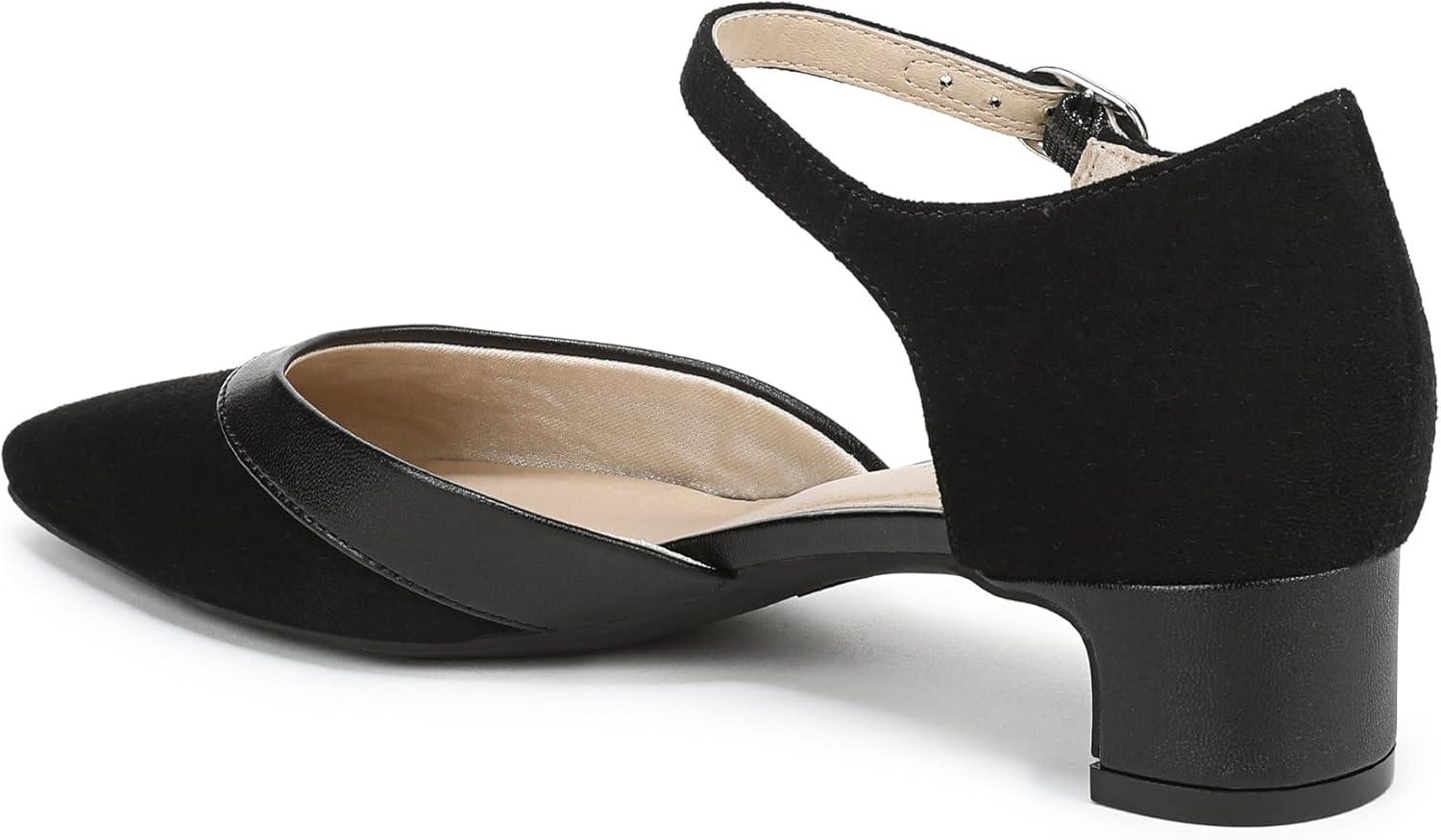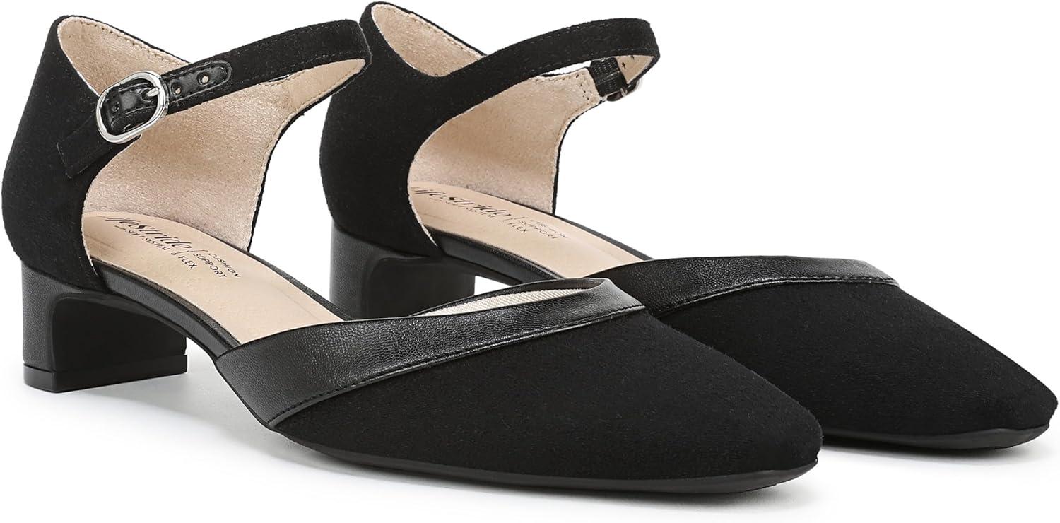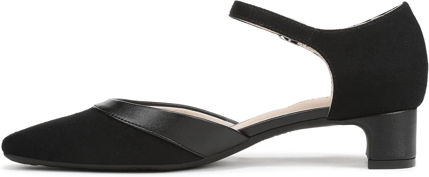 Classic and comfortable, these kitten heel pumps look timeless and feel effortless all day long. Faux leather and microfiber upper with an almond toe, cupped heel, ankle strap with adjustable buckle, and enhanced comfort. Trusted Soft System® comfort technology for unmatched cushion, support, and flexibility in every pair. Traction sole provides you with extra stability. Just Right Height 1 3/8 inch block heel.