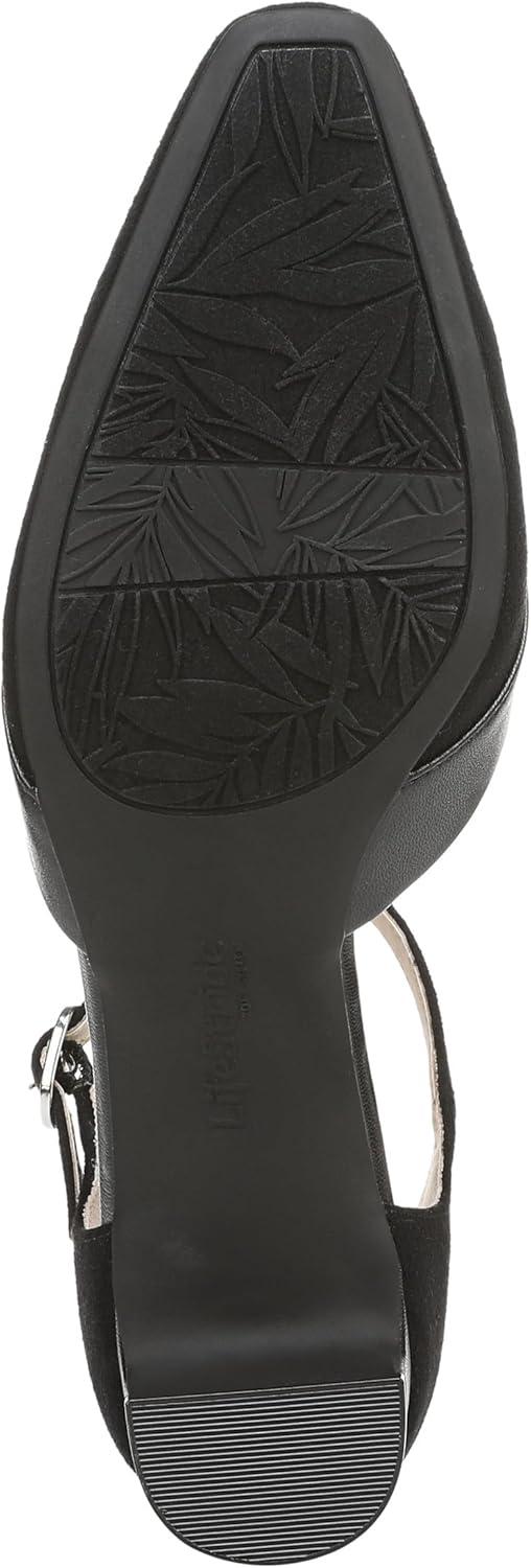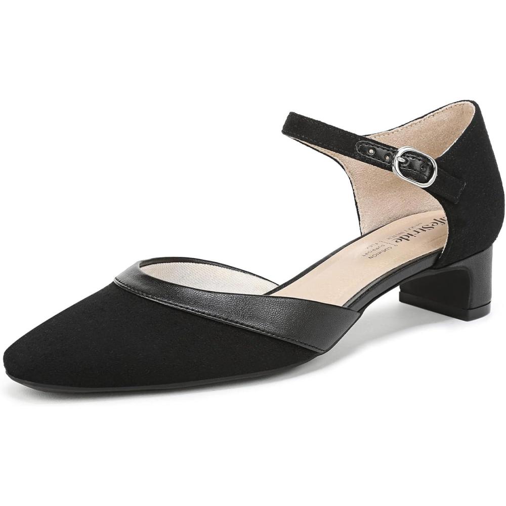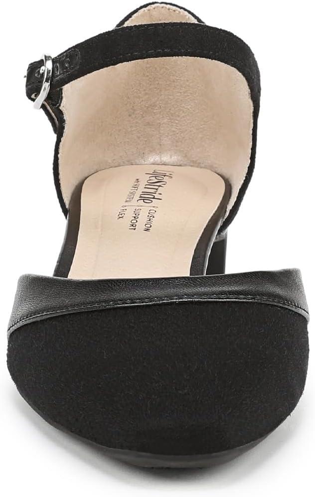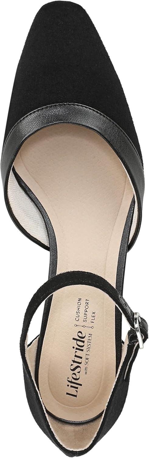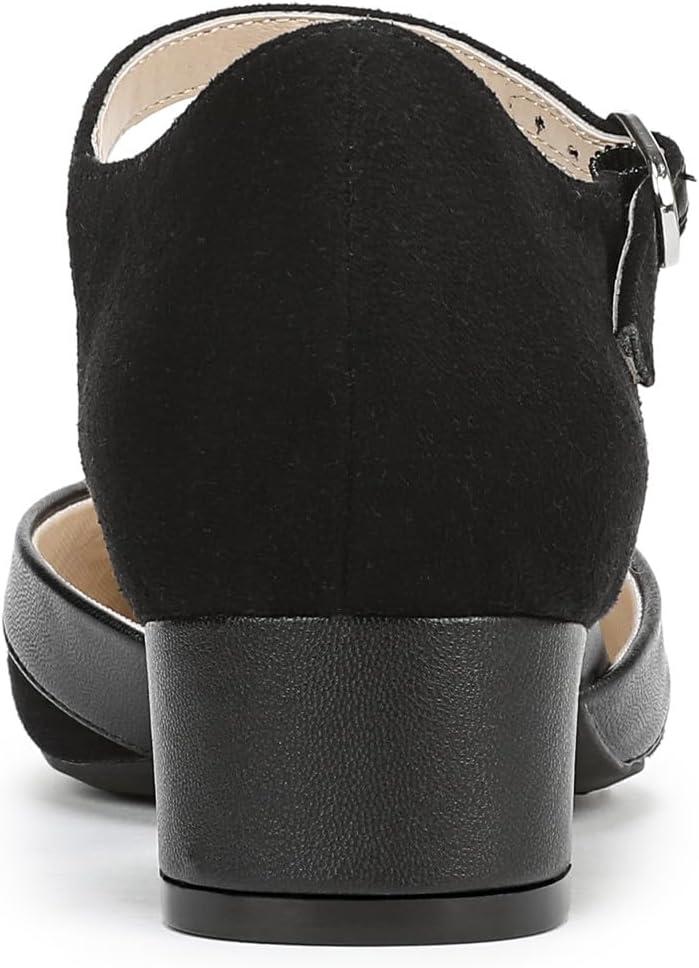 Classic and comfortable, these kitten heel pumps look timeless and feel effortless all day long. Faux leather and microfiber upper with an almond toe, cupped heel, ankle strap with adjustable buckle, and enhanced comfort. Trusted Soft System® comfort technology for unmatched cushion, support, and flexibility in every pair. Traction sole provides you with extra stability. Just Right Height 1 3/8 inch block heel.