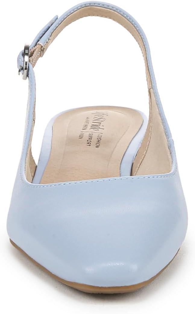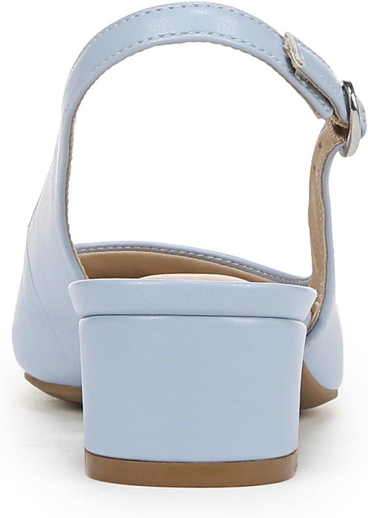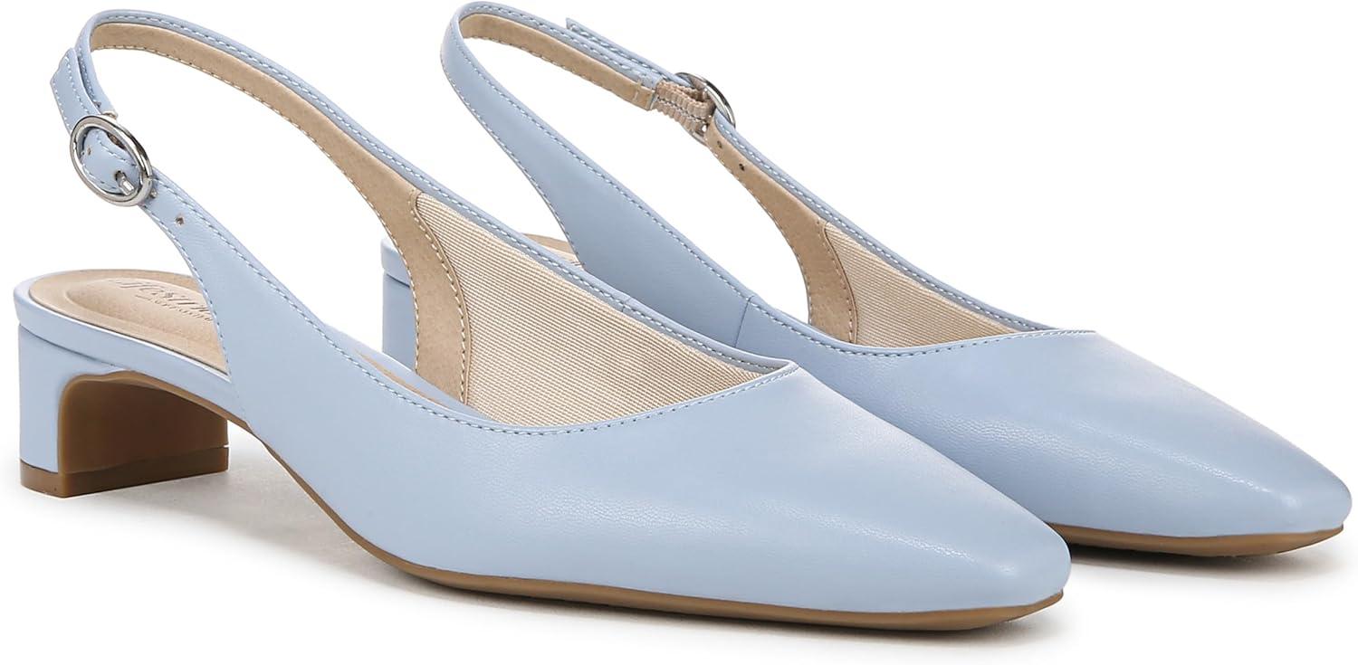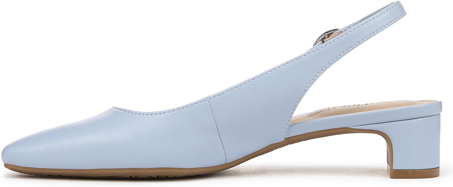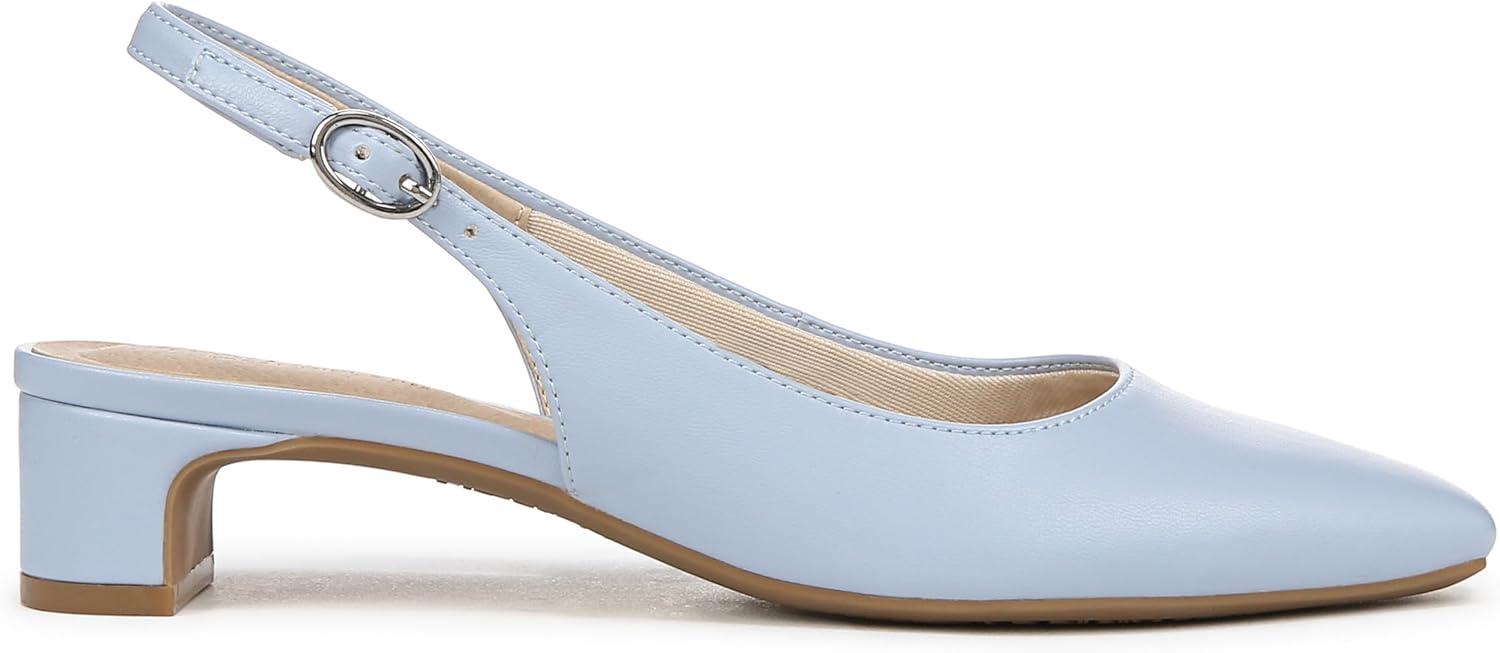 Look modern, yet timeless in these incredibly comfortable and chic women’s slingbacks. Kitten heel pumps designed with faux leather, a softly pointed toe, slingback strap with adjustable buckle, and modern block heel. Linings crafted from partially recycled materials. Trusted Soft System® comfort technology for unmatched cushion, support, and flexibility in every pair. Traction sole for extra stability. Just Right Height 1 3/8 inch block heel.