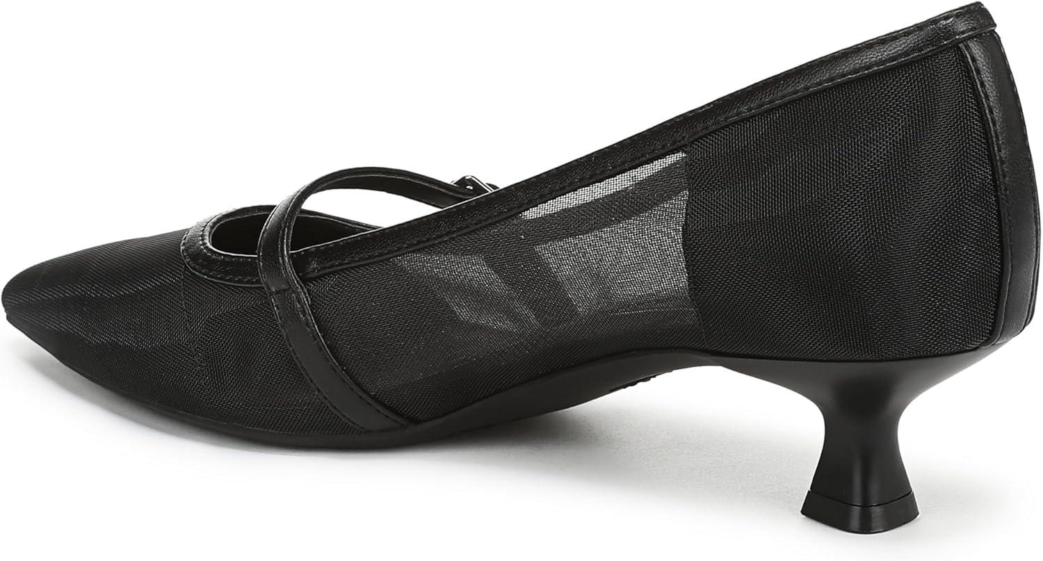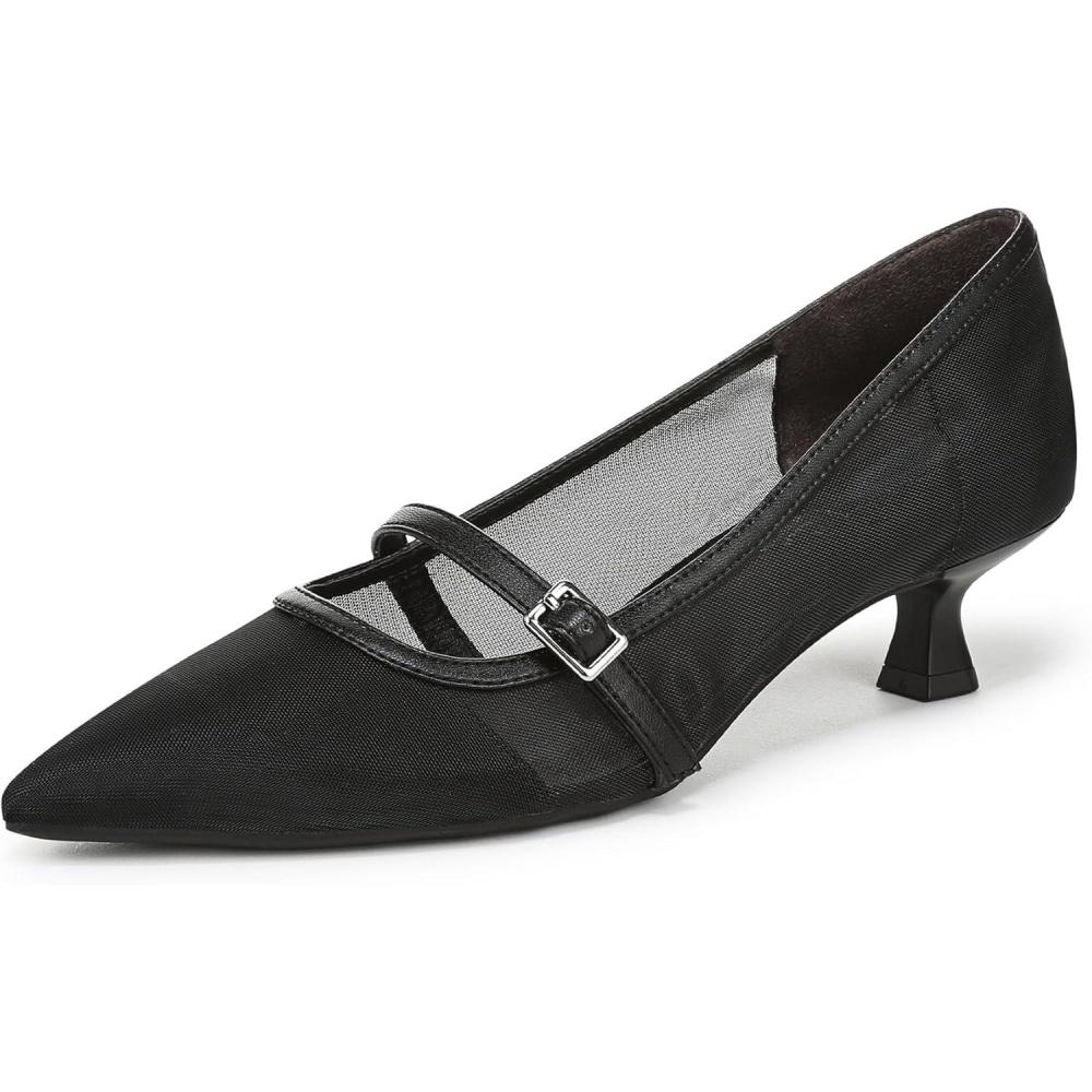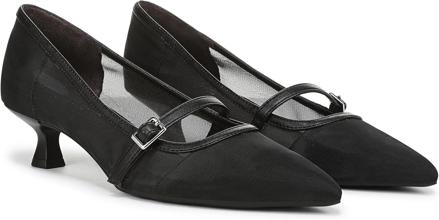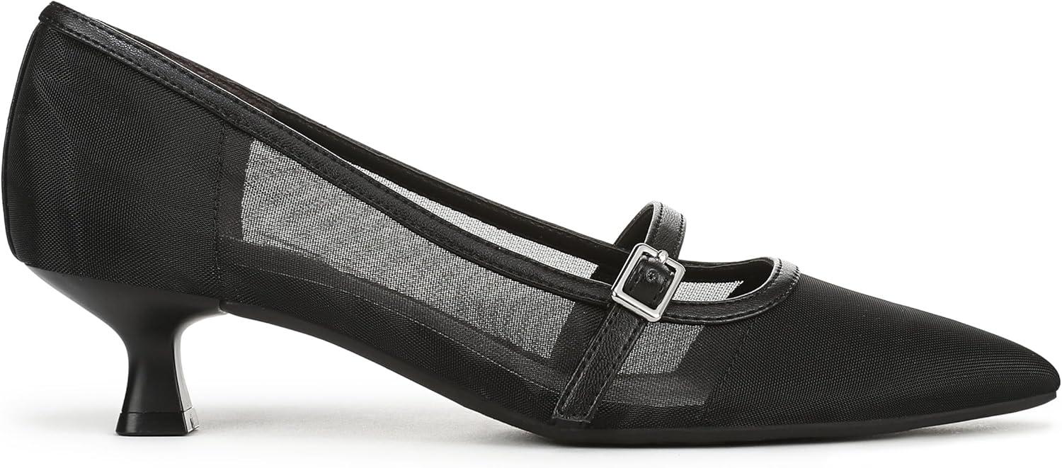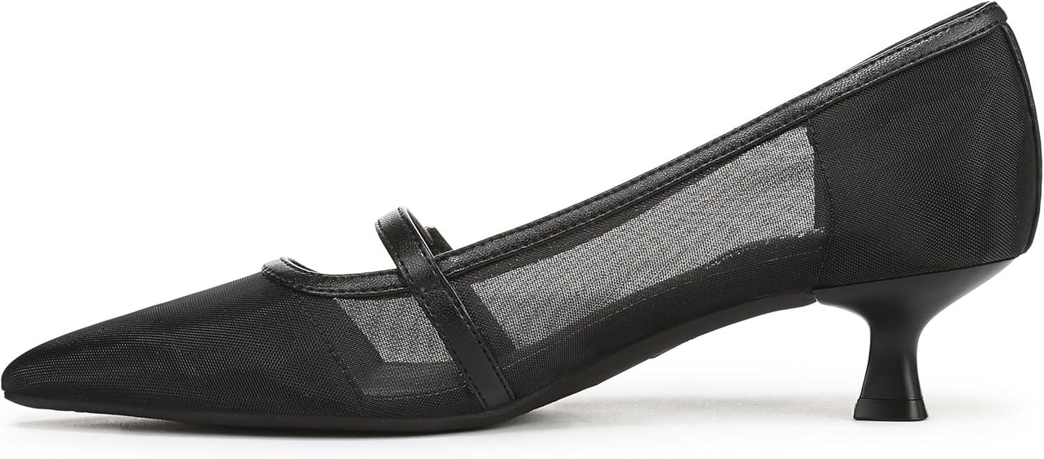 Mary Jane heels that look so chic. Get in on the trend in these incredibly comfortable pumps with a modern sculpted kitten heel. Faux leather upper with a softly pointed toe, Mary Jane strap with buckle detail, and sculpted heel. Linings crafted from partially recycled materials. Soft System® comfort package provides all-day support, flex, and cushioning. Traction sole for extra stability. Just Right Height 1 5/8 inch heel.