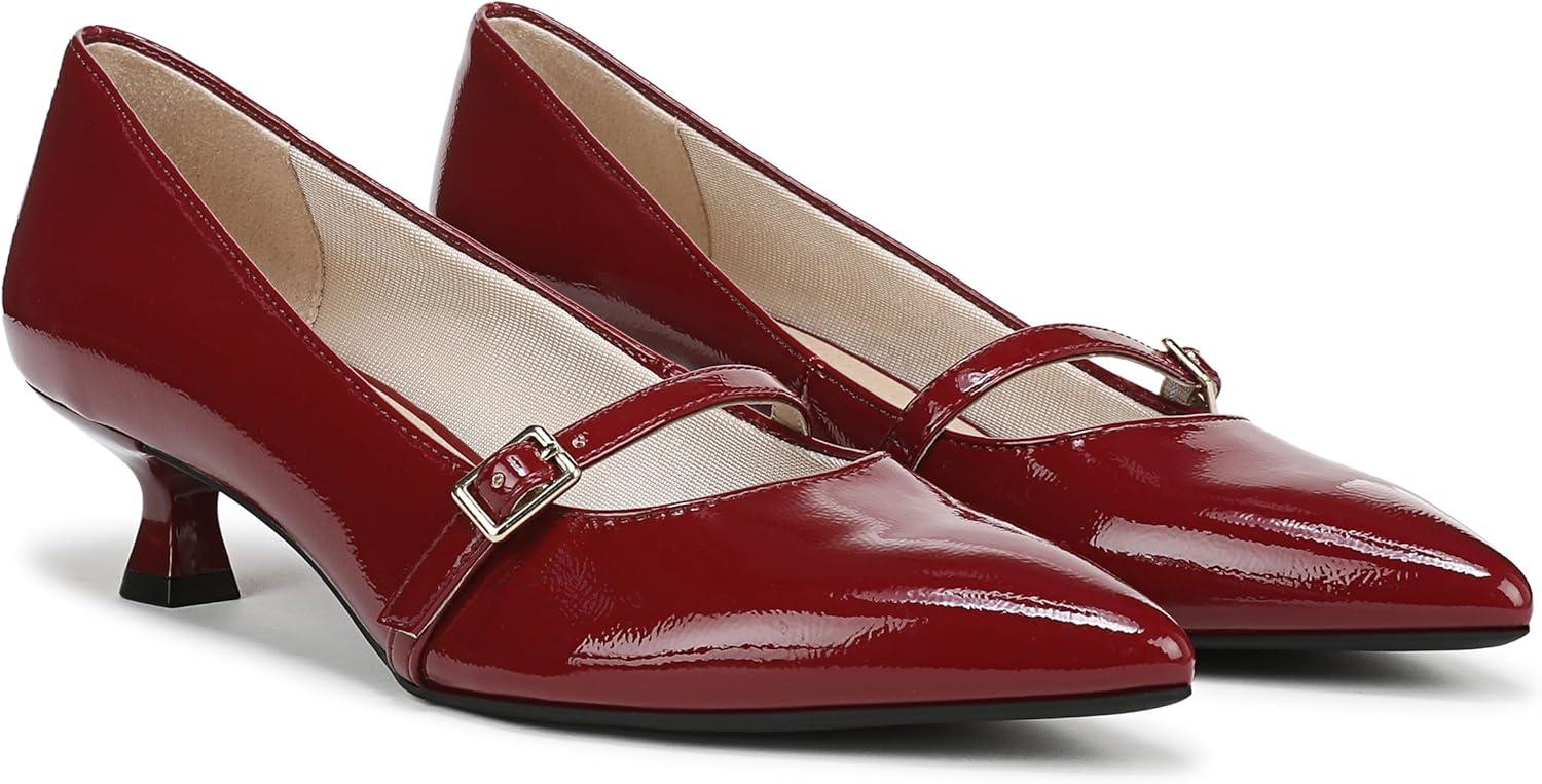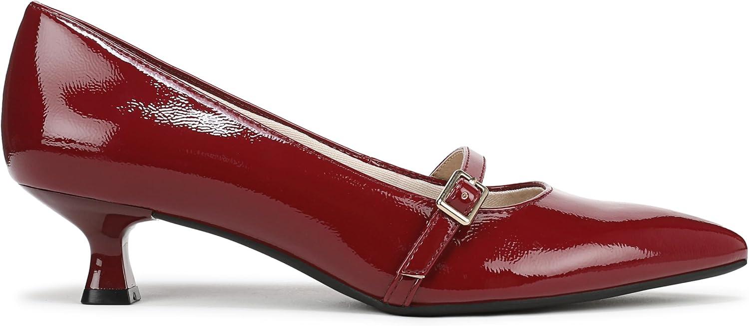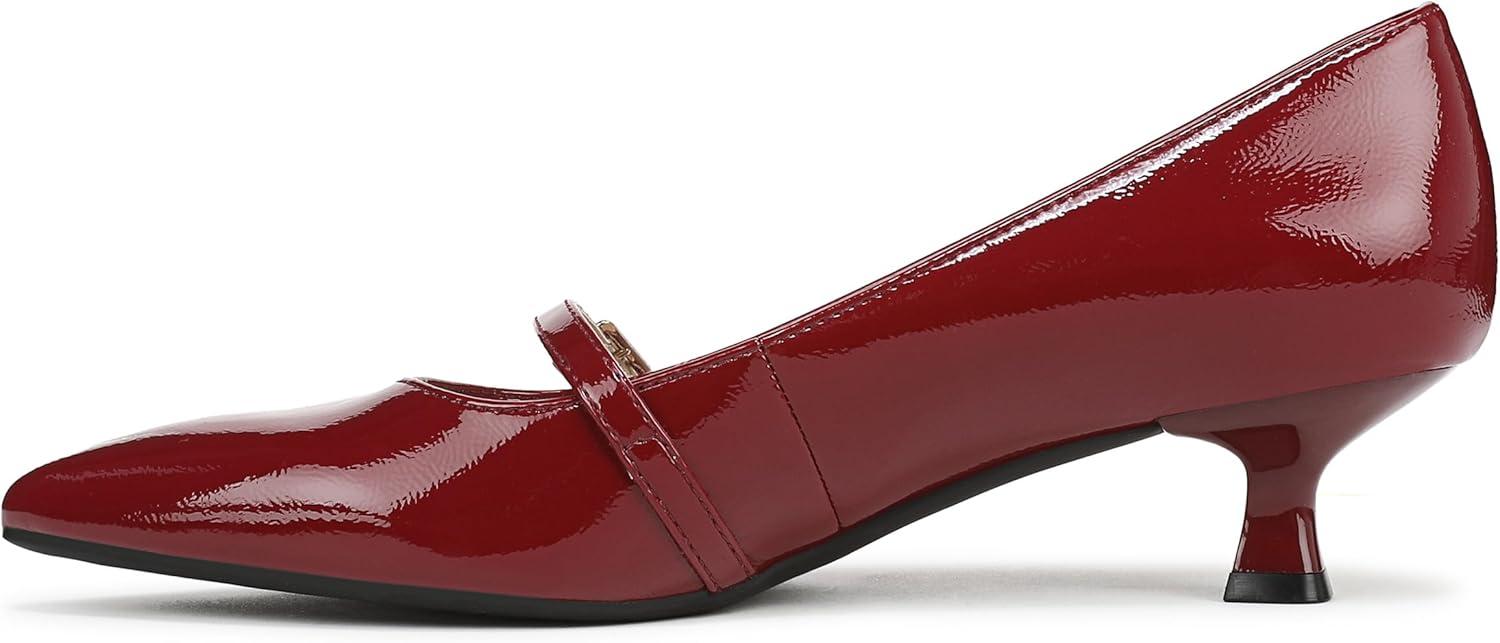 Mary Jane heels that look so chic. Get in on the trend in these incredibly comfortable pumps with a modern sculpted kitten heel. Faux leather upper with a softly pointed toe, Mary Jane strap with buckle detail, and sculpted heel. Linings crafted from partially recycled materials. Soft System® comfort package provides all-day support, flex, and cushioning. Traction sole for extra stability. Just Right Height 1 5/8 inch heel.