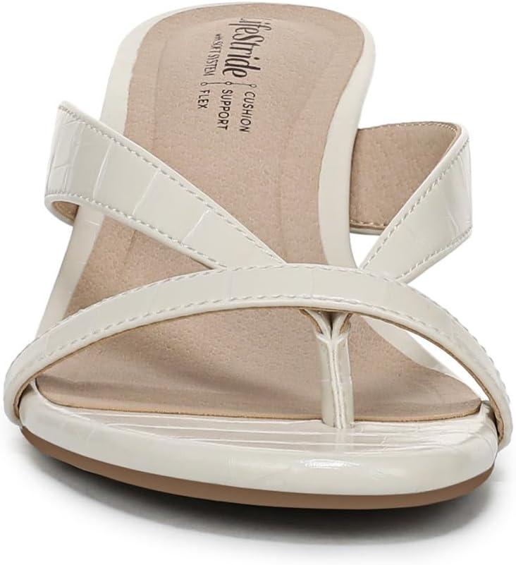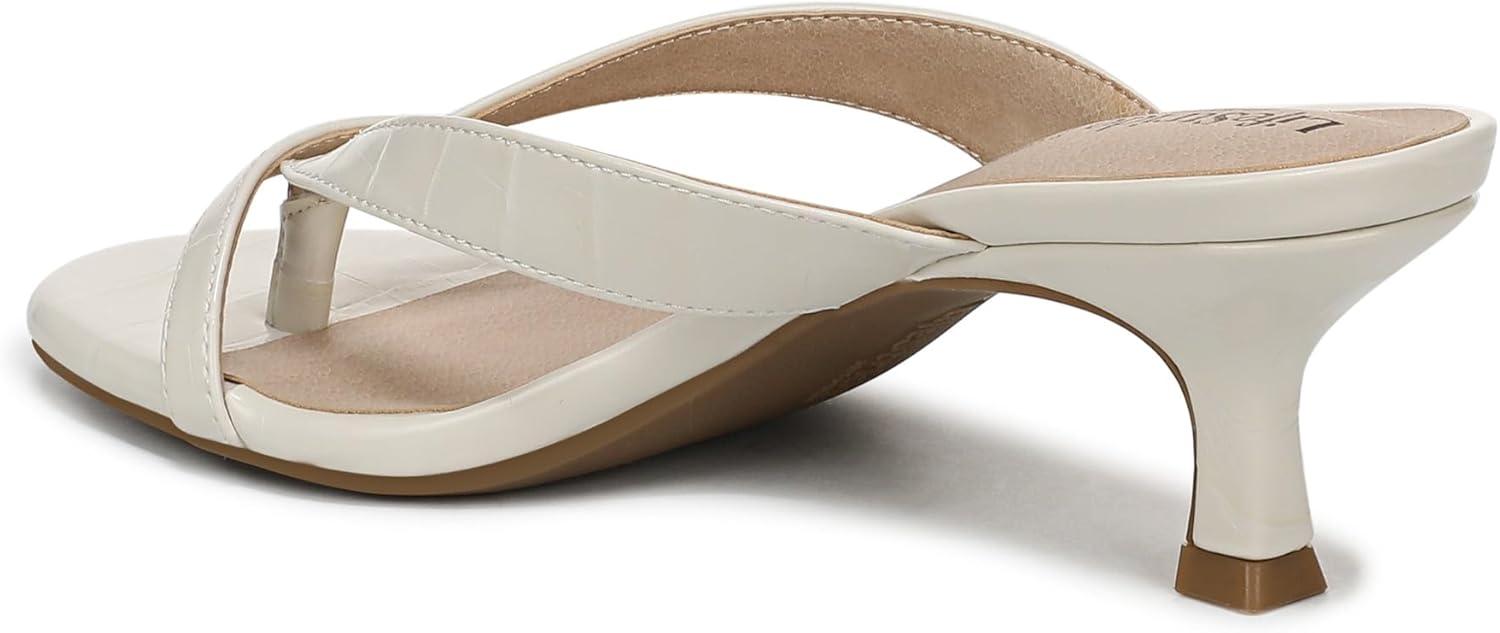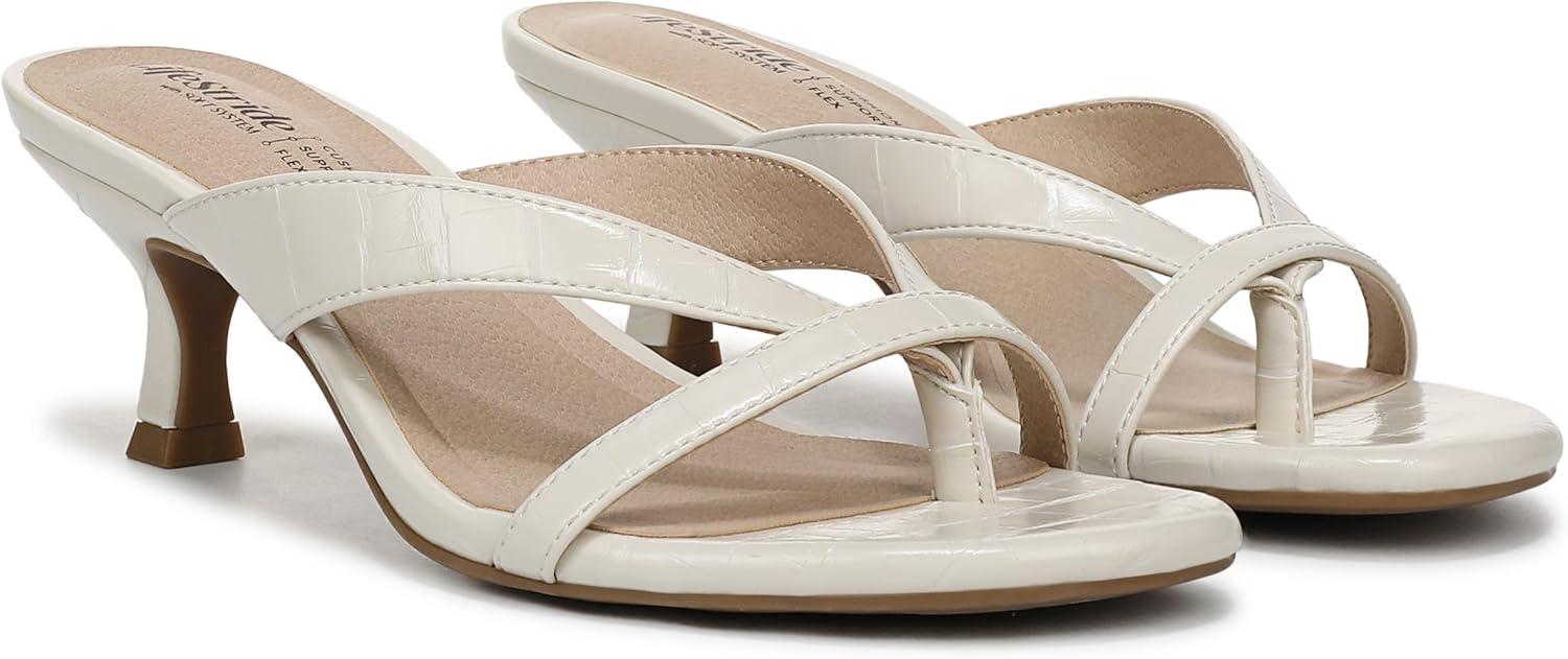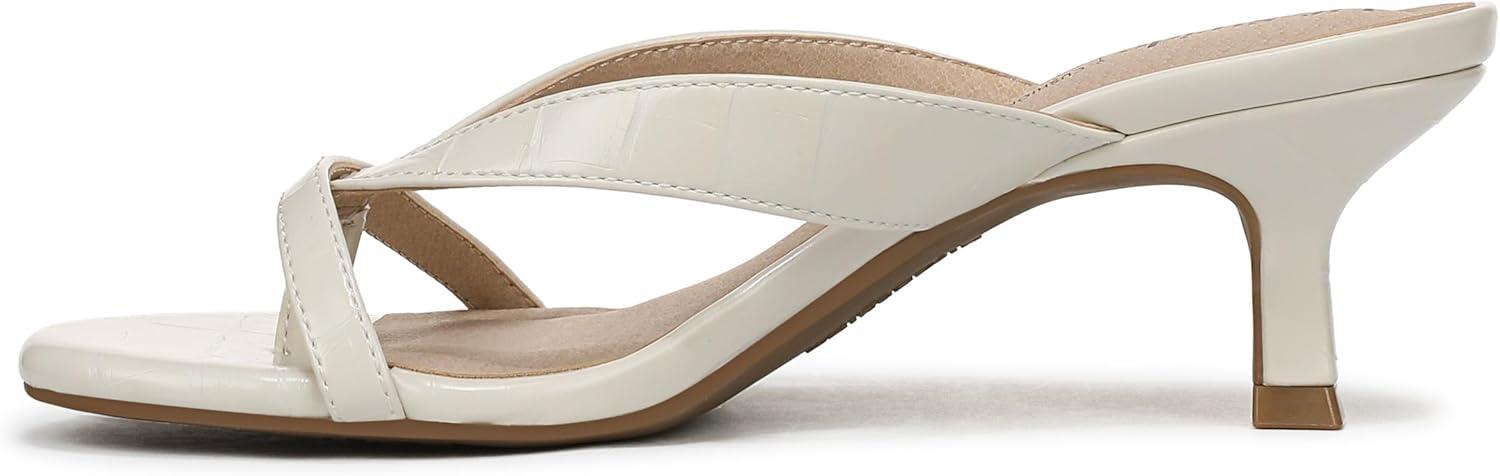 ALL-DAY COMFORT: Experience unmatched cushion, support, and flexibility with trusted Soft System comfort technology in every pair of these women's comfort sandals TRENDING STYLE: Versatile mid heel sandals with an easy 2 1/8 inch fashionable flared heel and smooth leather-like finish, perfect for day-to-night wear SECURE SLIP-ON: Effortless slip-on style with strappy cross vamp detail and two thin straps for a contemporary look in dressy sandals women will love ELEVATED DESIGN: Open toe sandals with a lightly cushioned insole and soft footbed, ideal for special occasions or as everyday dress sandals DURABLE BUILD: TPR sole offers flexibility and grip, making these women's thong sandals a lasting choice for dress sandals or casual outfits