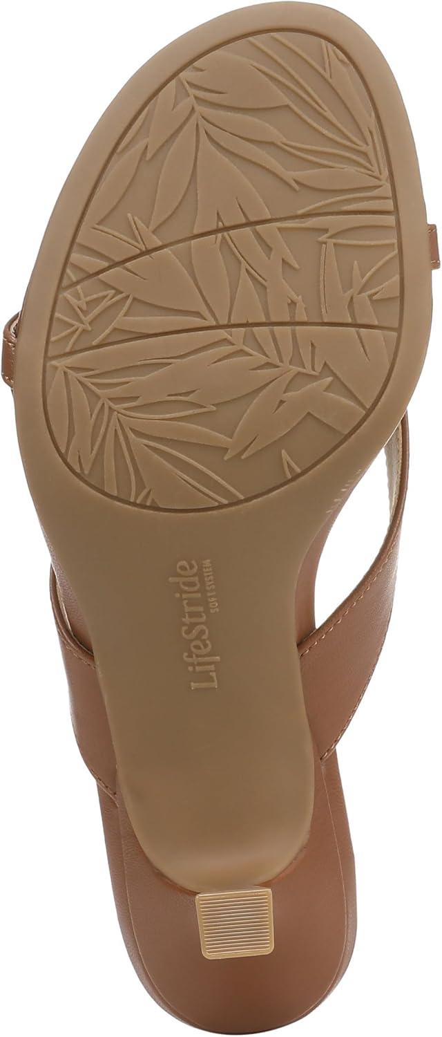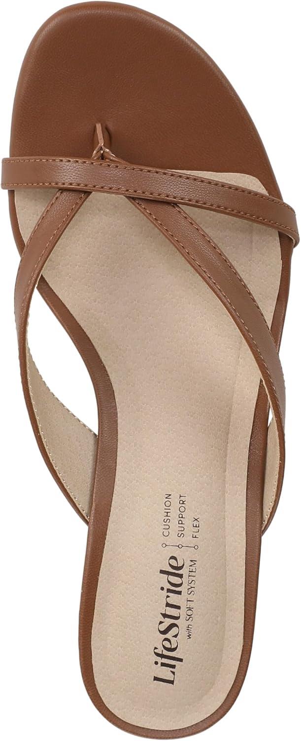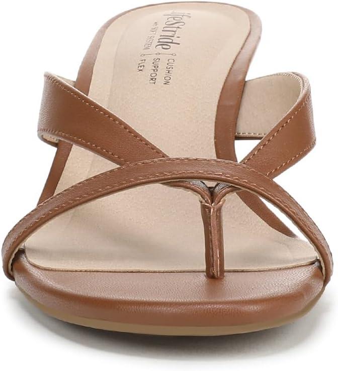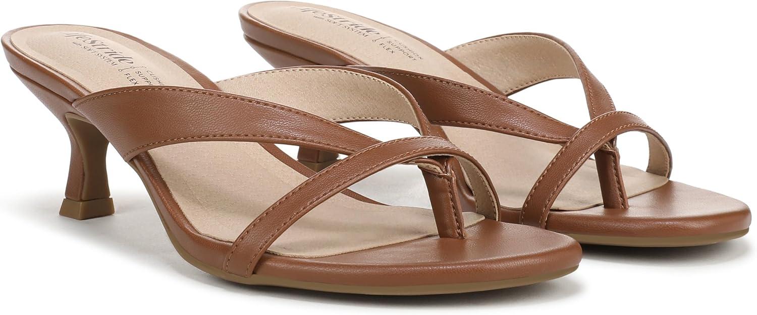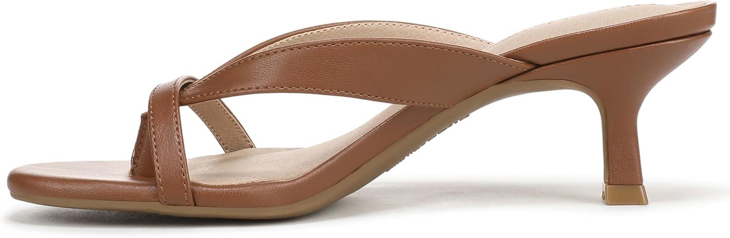 ALL-DAY COMFORT: Experience unmatched cushion, support, and flexibility with trusted Soft System comfort technology in every pair of these women's comfort sandals TRENDING STYLE: Versatile mid heel sandals with an easy 2 1/8 inch fashionable flared heel and smooth leather-like finish, perfect for day-to-night wear SECURE SLIP-ON: Effortless slip-on style with strappy cross vamp detail and two thin straps for a contemporary look in dressy sandals women will love ELEVATED DESIGN: Open toe sandals with a lightly cushioned insole and soft footbed, ideal for special occasions or as everyday dress sandals DURABLE BUILD: TPR sole offers flexibility and grip, making these women's thong sandals a lasting choice for dress sandals or casual outfits