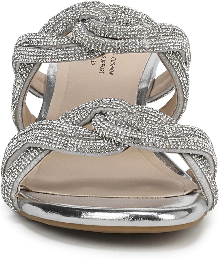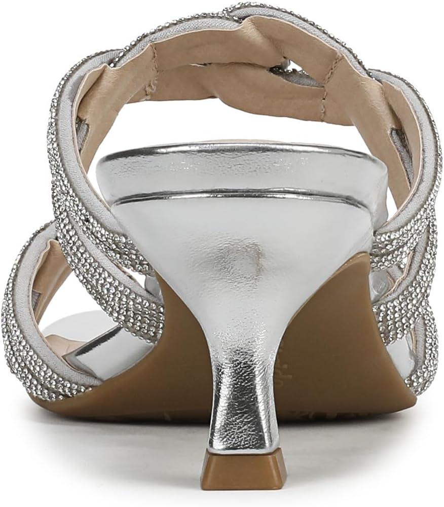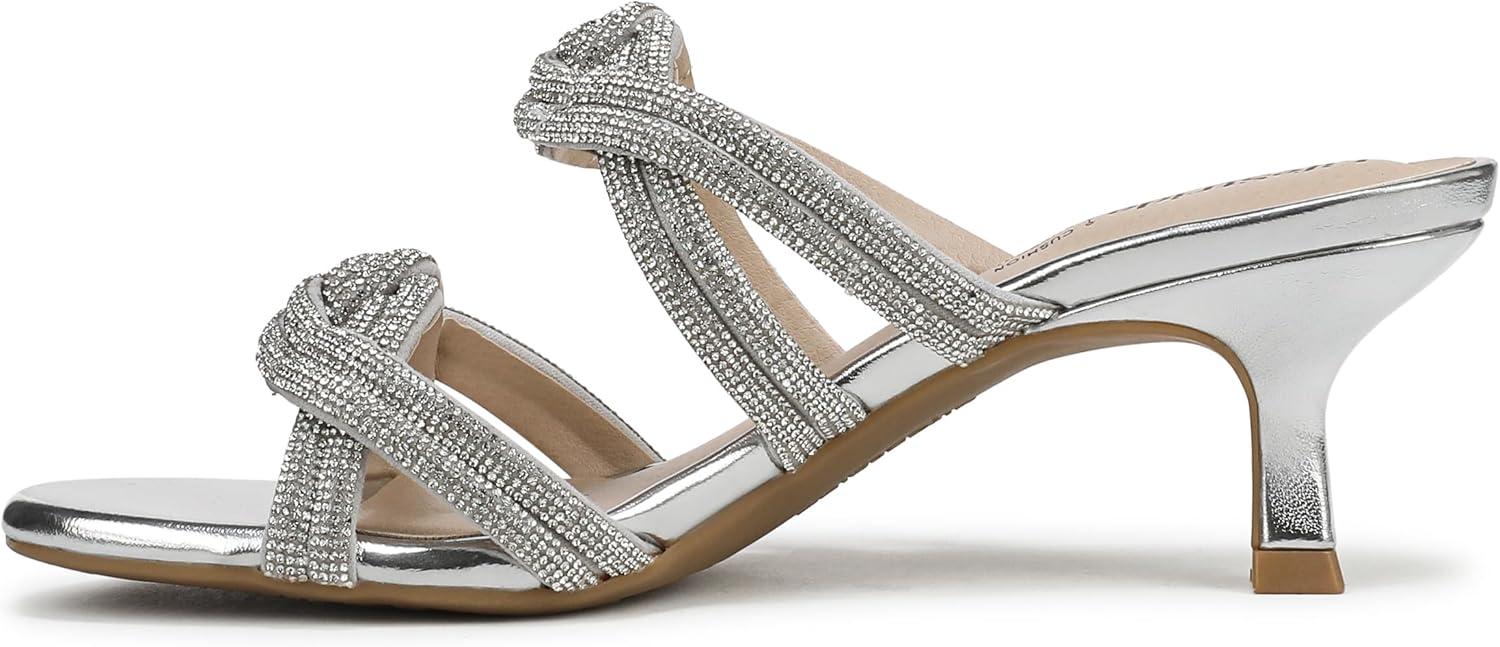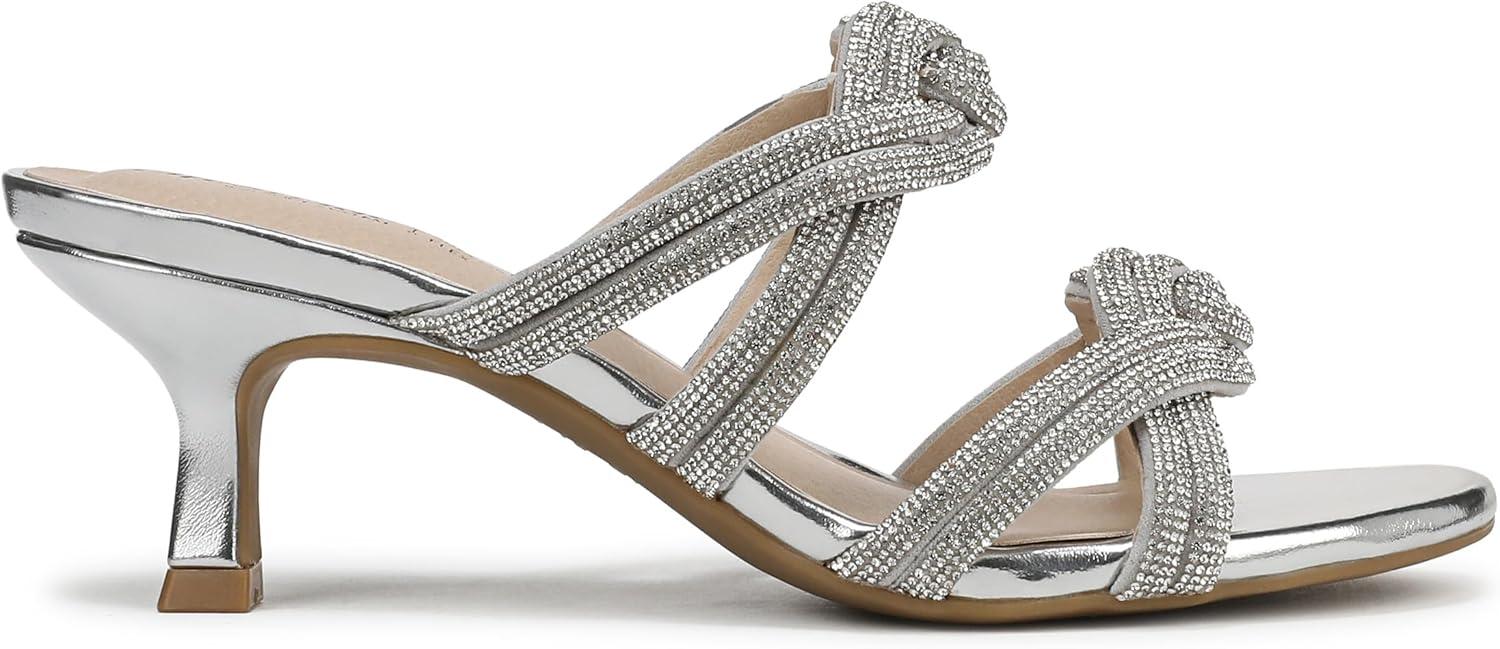 Get your glam on in these sparkly, endlessly comfortable dress sandals, perfect for special occasions. Featuring interwoven faux leather straps with sparkling rhinestones, an easy slip-on fit, and modern hourglass-shaped heel. Trusted Soft System® comfort technology for unmatched cushion, support, and flexibility in every pair. Traction sole for extra stability. Just Right Height 2 1/8 inch heel.
