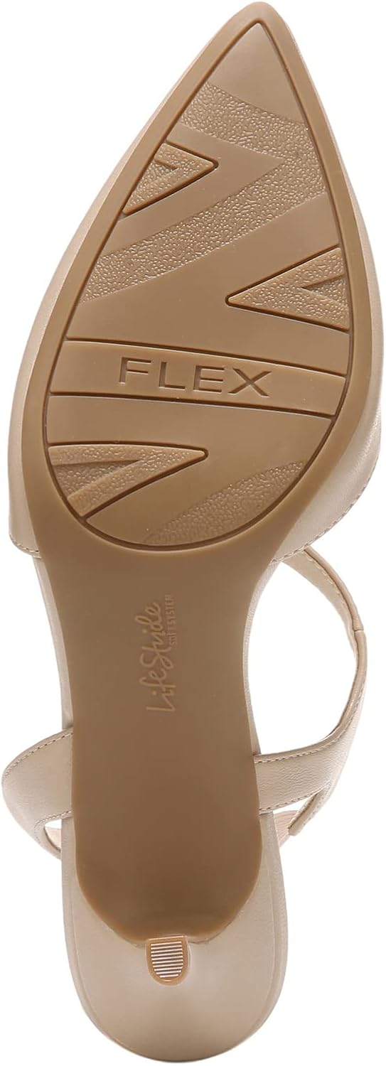 Luxe lines. An elegant diagonal strap and just-right heel on these womens dress shoes lets you show up in style every time. Faux leather with a pointed toe, heel strap with stretch, and open cutout design. Insole board partially crafted with recycled materials. Soft System® comfort package provides all-day support, flex, and cushioning. Traction sole provides you with extra stability. Just Right Height 2.75 inch heel.